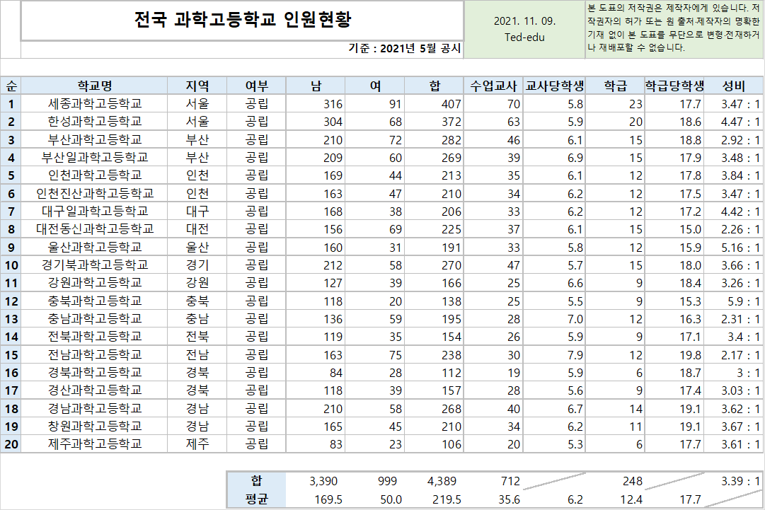 | 전국 영재학교 인원현황 (성비, 학생수, 교사수, 학급당학생수, 교사당학생수 등 - 2021학년도 기준) (0) | 2021.11.09 |