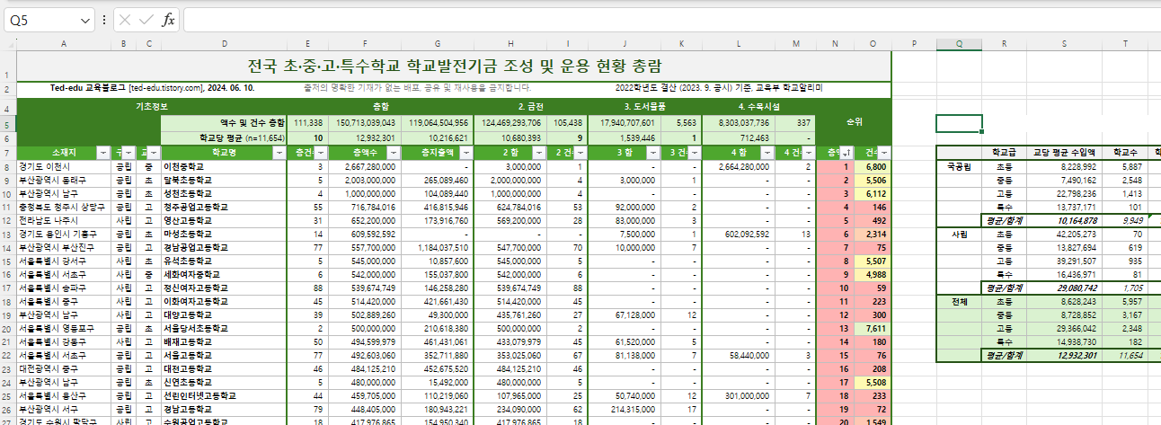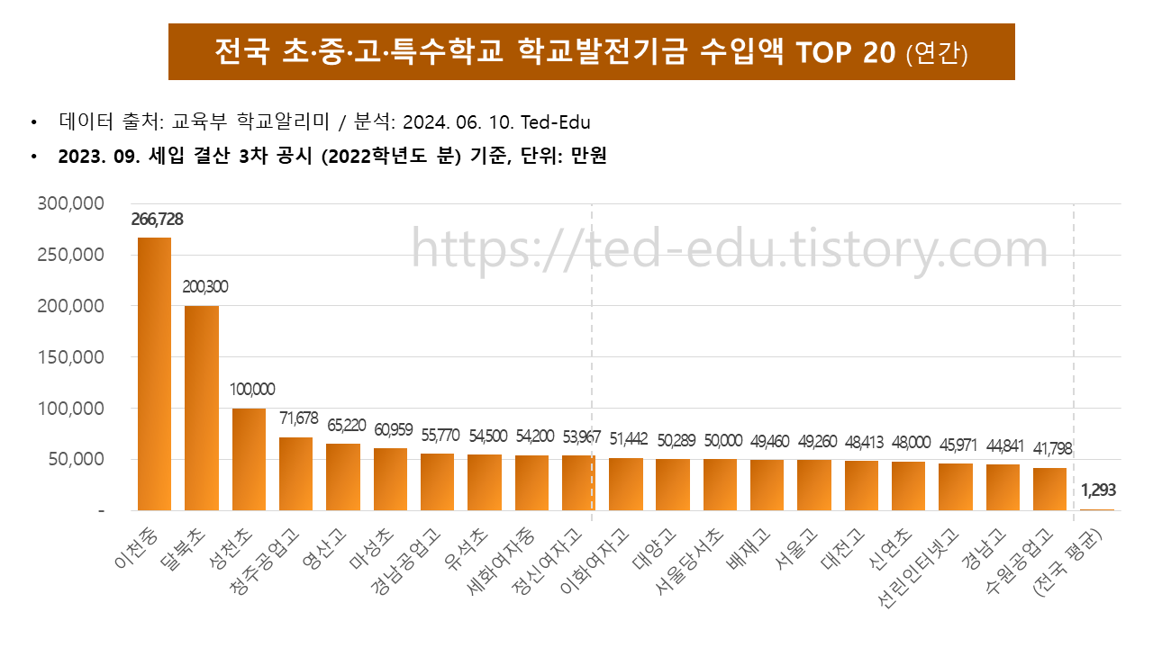 ▶ 1. 전국 초·중·고·특수학교 학교발전기금 수입액 상위 순위표 (+ 하위 순위 정보)