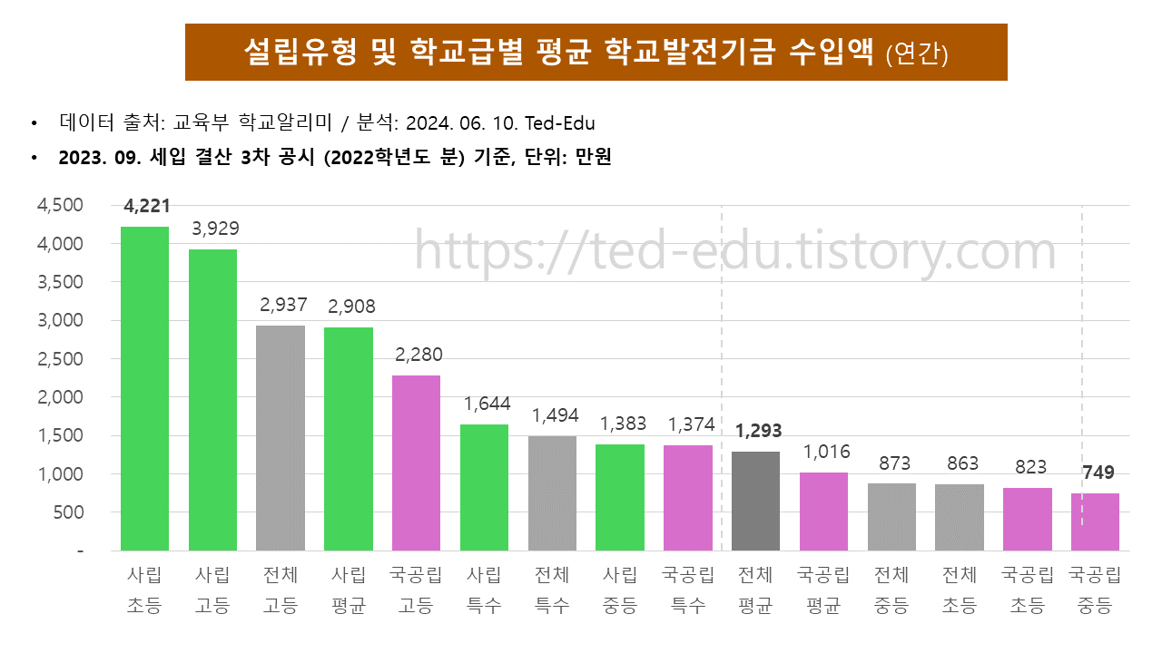 ③ 설립유형(국·공립/사립) 및 학교급(초중고특수)별 연간 평균 학교발전기금 수입액,
